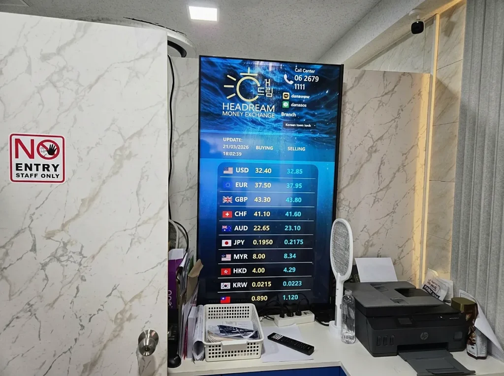 원화뿐 아니라 달러, 엔화, 위안화, 유로 등 다양한 통화를 취급하며, 여행 후 남은 바트를 원화로 되돌리는 역환전과 24시간 온라인 송금 서비스도 제공하고 있습니다.